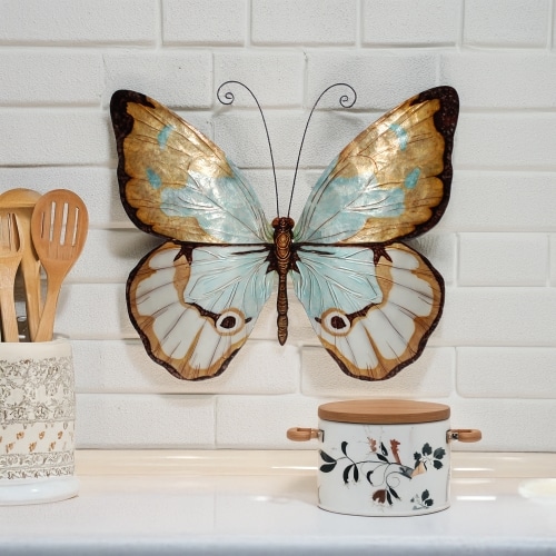 The basic frame of the butterfly is created using tin, which is powder-coated with a black finish and makes this piece safe to use outdoors. The edges of the frame are reinforced using thicker tin wire. The front of this piece is adorned in areas with capiz shell, an oyster native to the Philippines, before being hand-painted and sealed with a water-based sealant. The primary purpose of this oyster to provide a source of food, however, the shell is a sustainable by-product that can be used for decoration. The capiz shell subtly replicates the reflective qualities of butterflies in nature. The entire piece is lightweight and has an eyelet in the back allowing it to be hung using a finishing nail, command strip, or a push pin.