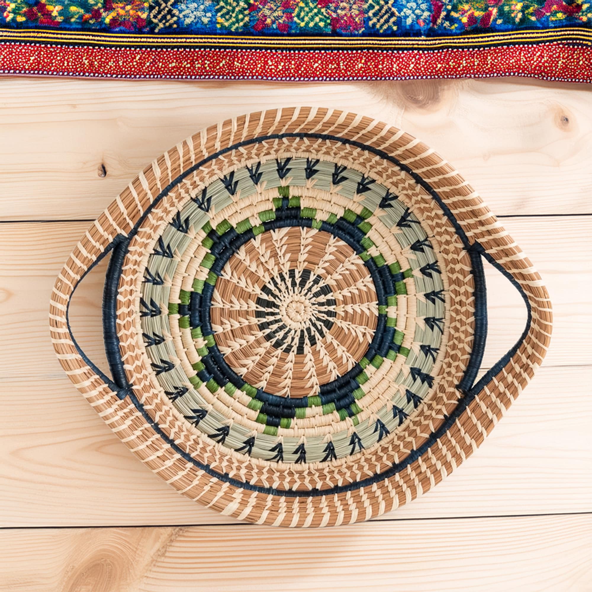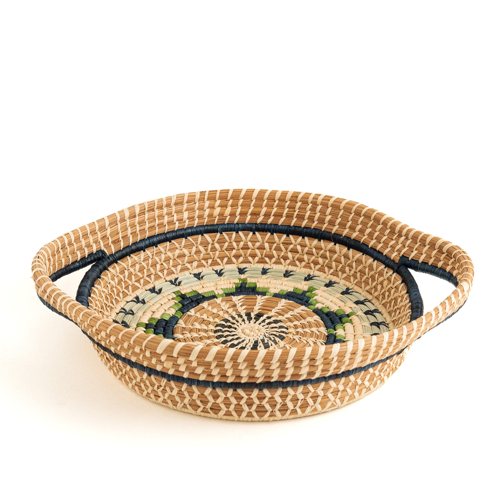 There’s a quiet radiance to this basket—like holding a piece of the sky shaped by hand. Named Chumil, the Kaqchikel word for “star,” this woven design draws your eye inward with its natural spiral, ending in a central star rendered in deep greens and indigo blues. It’s both grounding and luminous—a visual anchor rooted in tradition.
