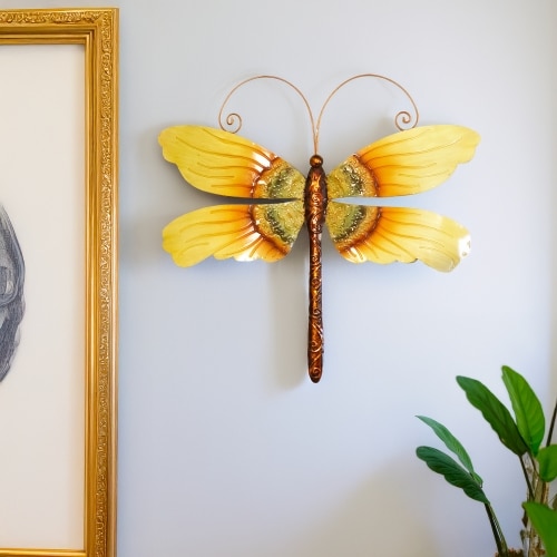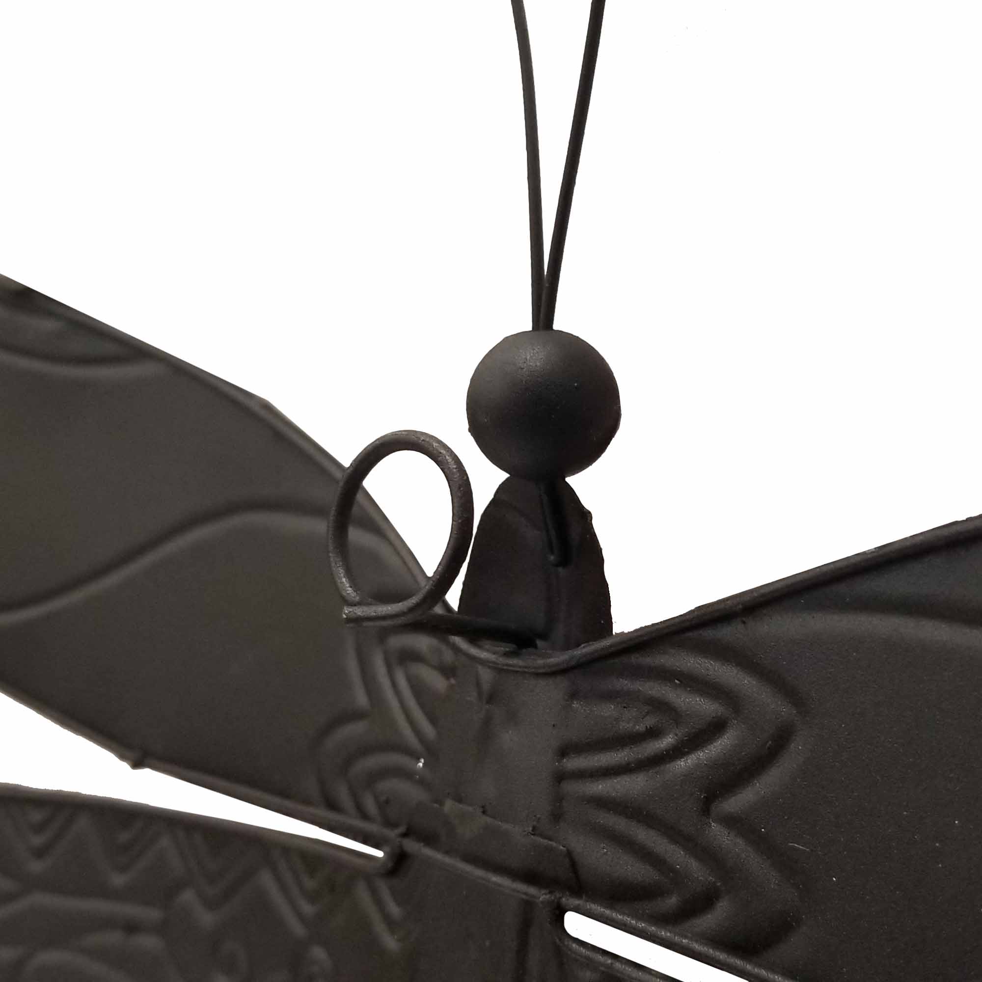 The basic frame of the dragonfly is created using tin, which is powder-coated with a black finish and makes this piece safe to use outdoors. The edges of the frame are reinforced using thicker tin wire. The front of this piece is adorned in areas with capiz shell, an oyster native to the Philippines, before being hand-painted and sealed with a water-based sealant. The primary purpose of this oyster to provide a source of food, however, the shell is a sustainable by-product that can be used for decoration. The capiz shell subtly replicates the reflective qualities of dragonflies in nature. The entire piece is lightweight and has an eyelet in the back allowing it to be hung using a finishing nail, command strip, or a push pin.